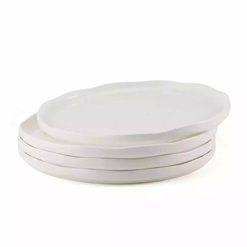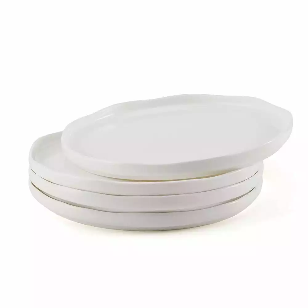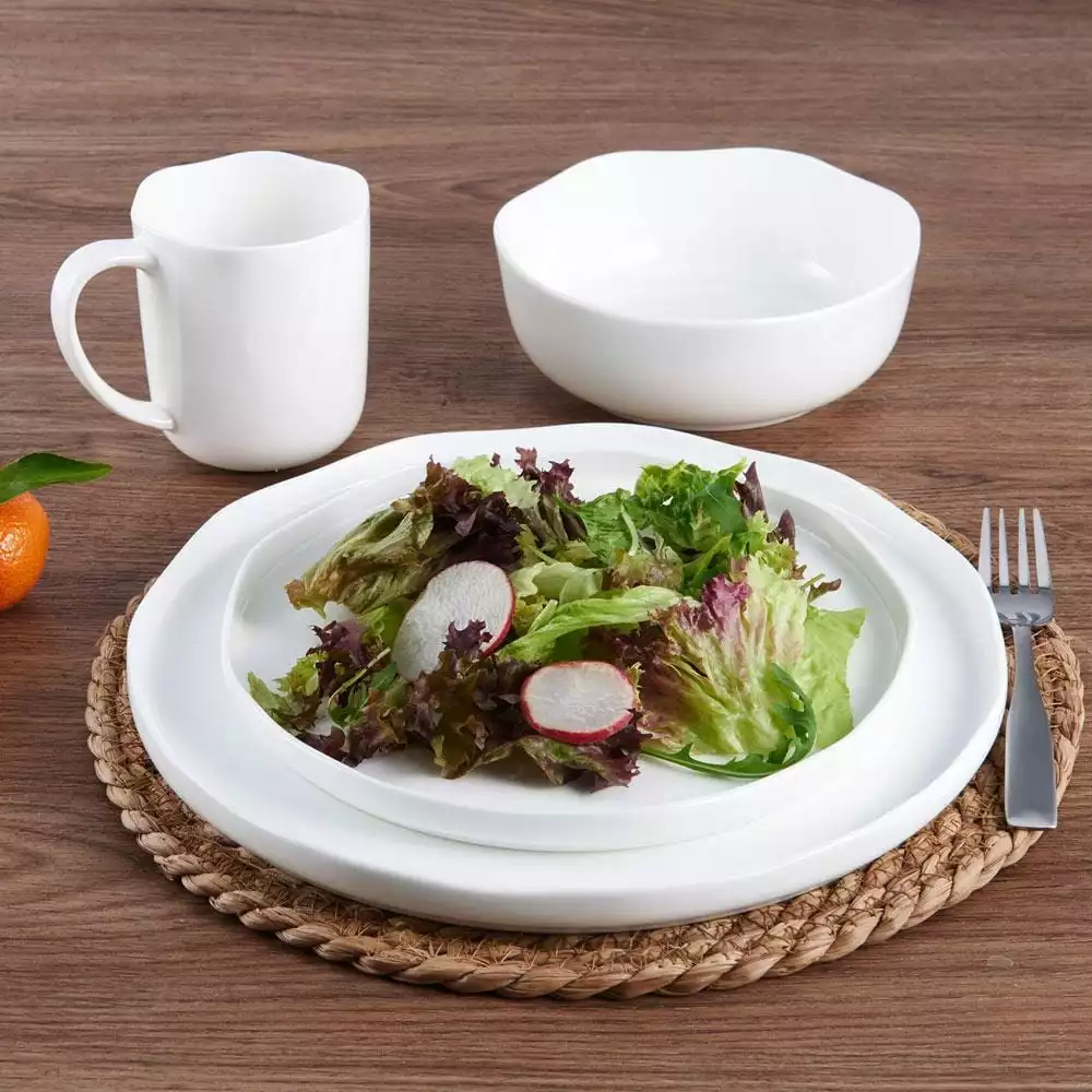 This Mikasa Adelaide Dinnerware Set features a distinctly modern twist. Round pieces are given a contemporary, organic design element, with uniquely curved rim edges and plates with raised sides. Crafted of bone china. 16 piece dinnerware set, service for four, includes (4) each: 10-1/2 inch dinner plate, 8-1/4 inch salad plate, 5-3/4 inch bowl, and 14 ounce mug. Microwave and dishwasher safe.