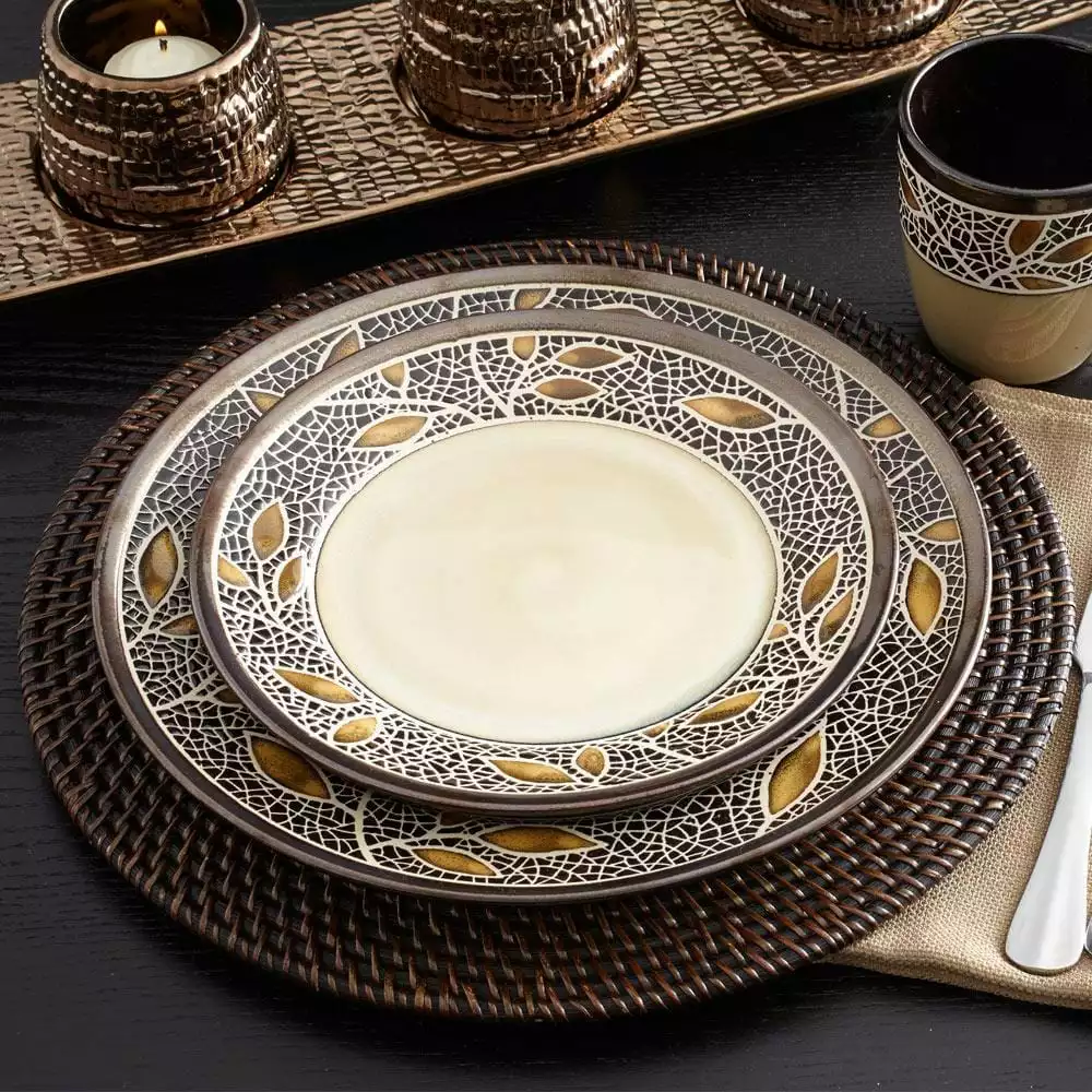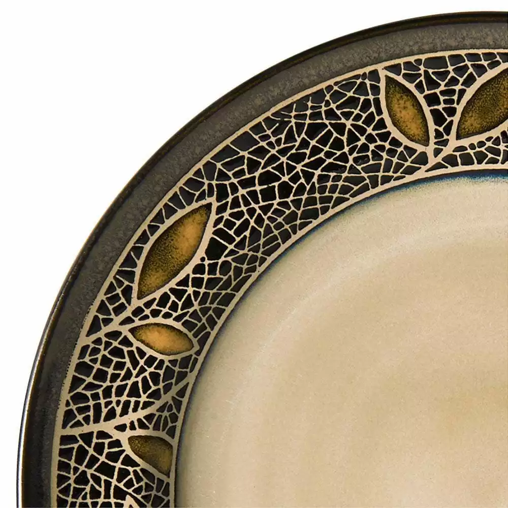 This Mikasa Alexandria Set of 4 Dinner Plates feature warm, tranquil earth tones of bold espresso and soothing beige, and a striking rim design adorned with sprigs of golden brown leaves and highlighted by a crackle effect, with a reactive glaze finish. Due to the nature and hand-crafted qualities of reactive glaze, no two pieces are exactly alike and will exhibit unique variations in color and pattern. Product may slightly differ from image shown.