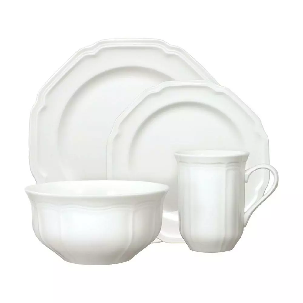 This uniquely-shaped all-white design adds a touch of elegance to a traditional setting. It coordinates perfectly with both formal and casual stemware and flatware as well as our own Antique Orchard pattern. There is a complete suite of accessories to create a classically stylish casual dining statement. This high quality porcelain pattern is dishwasher safe, microwave safe and chip resistant. 16 piece dinnerware set, service for (4), includes (4) each: 10-1/2 inch dinner plate, 8-1/2 inch salad plate, 6 inch diameter (32 ounce) cereal bowl and 12 ounce mug.