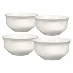 This uniquely-shaped all-white design adds a touch of elegance to a traditional setting. It coordinates perfectly with both formal and casual stemware and flatware as well as our own Antique Orchard pattern. There is a complete suite of accessories to create a classically stylish casual dining statement. This high quality porcelain pattern is dishwasher safe, microwave safe and chip resistant. The set contains four 6″ cereal bowls (32 oz).