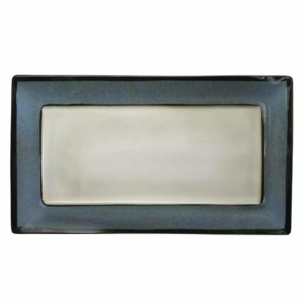 Crafted of Stoneware, featuring a reactive glaze. Due to the nature and hand-crafted qualities of reactive glaze, no two pieces are exactly alike and will exhibit unique variations in color and pattern. Product may slightly differ from image shown. Use this rectangular platter to serve eggs with bacon & toast or stir fry with rice. Makes a handsome companion at a luncheon spread piled high with sandwiches or baked goodies. Microwave and dishwasher safe. Rectangular platter measures 16 inch long x 9 inch wide.