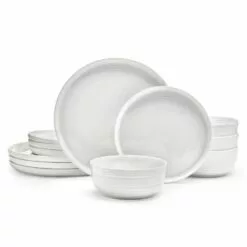 This Callie Dinnerware Set features a clean white design in modern shapes, and each piece is encircled by an embossed, striated line design with a distinct raised edge, adding a contemporary and stylish touch to your table.