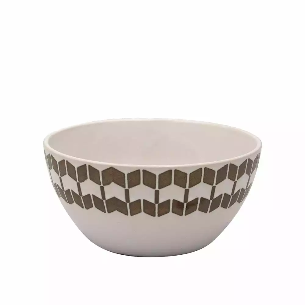 This Celebrations Chevron Soup Cereal Bowl features a white background with a distinct gold band pattern around the upper rim, and will add a stylish, festive look to your table.