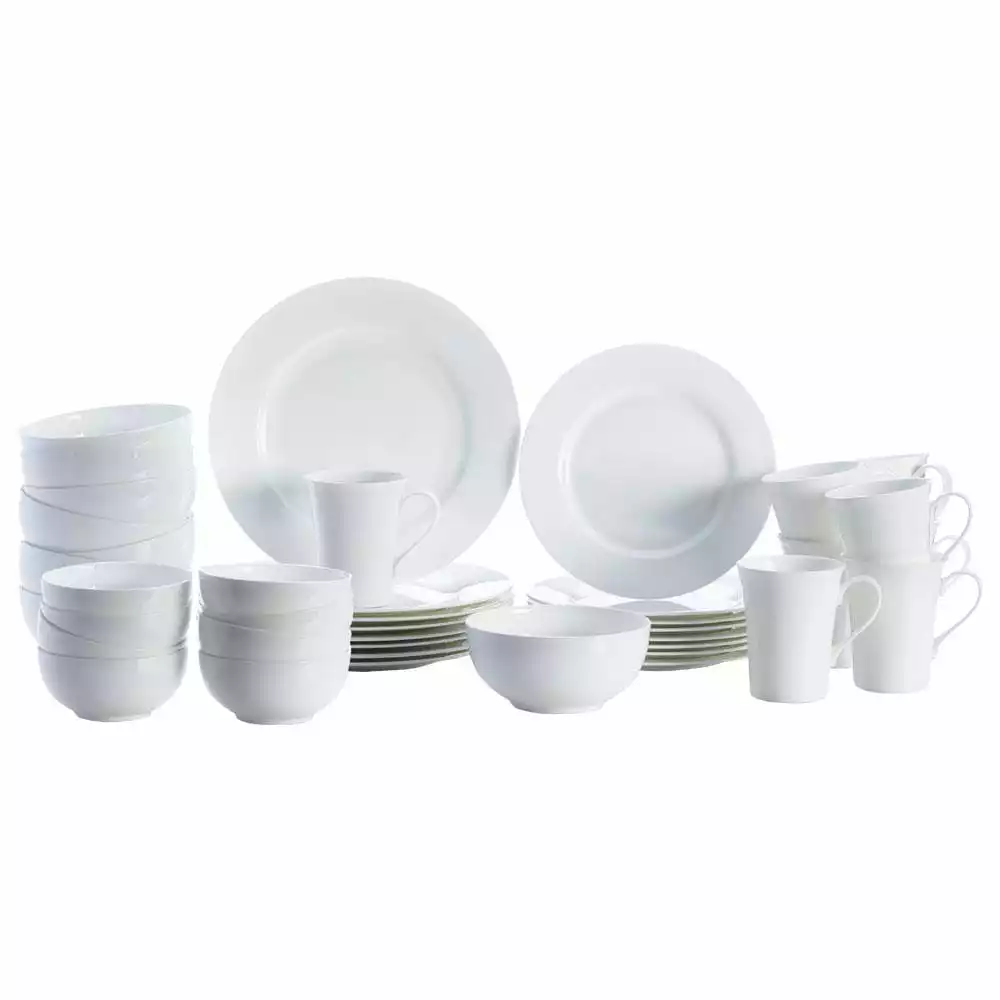 Mikasa Delray dinnerware brings sophistication to any table using minimalist style, clean lines, and smooth, pure white surfaces. Made of high quality bone china this collection is casual and stylish and great for everyday use. Chip resistant, microwave, dishwasher, freezer and oven safe. 40 piece dinnerware set, service for eight, includes (8) each: 11 inch dinner plate, 9 inch salad plate, 6 inch diameter (24 ounce) cereal bowl, 4-1/4 inch diameter (8 ounce) fruit bowl and 14 ounce mug.
