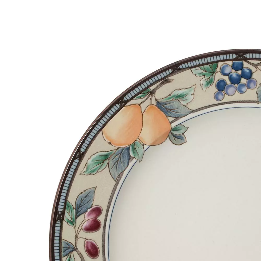 Colorful fruits and leaves enliven the Garden Harvest pattern. This longtime favorite is perfect for everyday use and has a wide array of accessories to create a complete casual dining statement. This pattern coordinates perfectly with casual stemware and flatware and is dishwasher safe, oven safe, freezer safe and microwave safe. Crafted of stoneware. Salad plate measures 8-1/4 inch diameter.