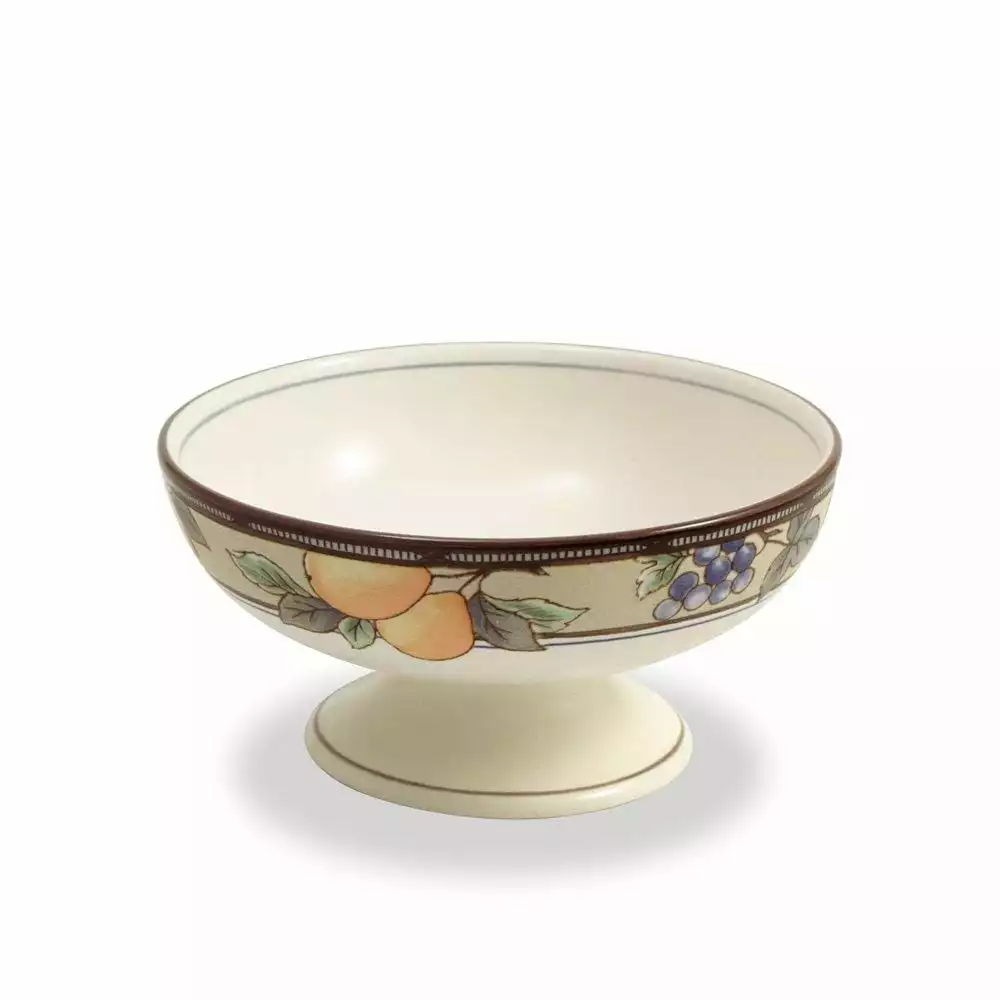 Colorful fruits and leaves enliven the Garden Harvest pattern. This longtime favorite is perfect for everyday use and has a wide array of accessories to create a complete casual dining statement. This pattern coordinates perfectly with casual stemware and flatware and is dishwasher safe, oven safe, freezer safe and microwave safe. This attractive pedestal Sherbet Bowl will bring the final course to your meal in style. Use to serve sherbet and ice cream, but also ideal for fruit cocktails, creamy puddings, apple crisp,cobblers and more! Crafted of stoneware. Sherbet dish measures 4-3/4 inch diameter x 2-3/8 inch high.