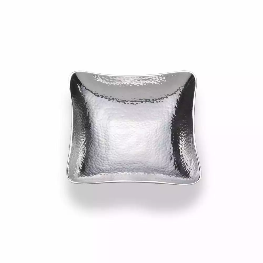 Perfect for serving your guests everything from mashed potatoes to pasta. This bowl is durable and has a rustic hammered finish. It is crafted of food-safe alternative metal alloy. This medium bowl will not scratch or dent under normal use. Oven safe for warming food and freezer safe. Hand wash. Hammersmith square bowl measures 8-1/4 inch square x 2-1/4 inch high.