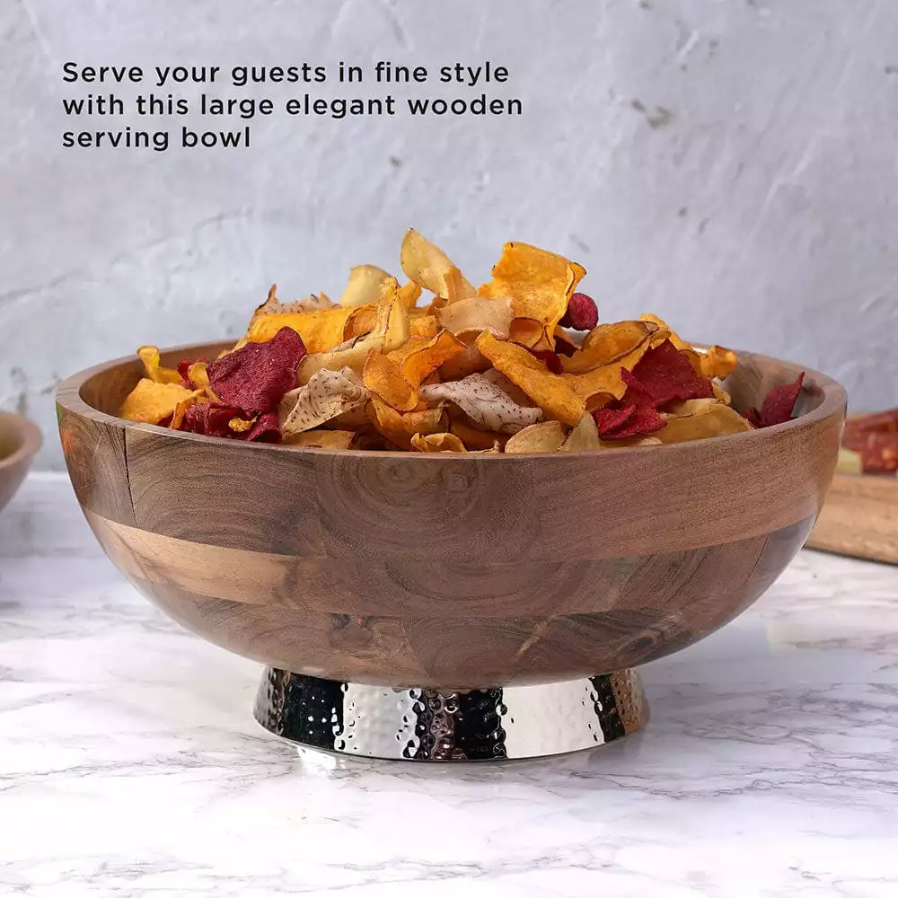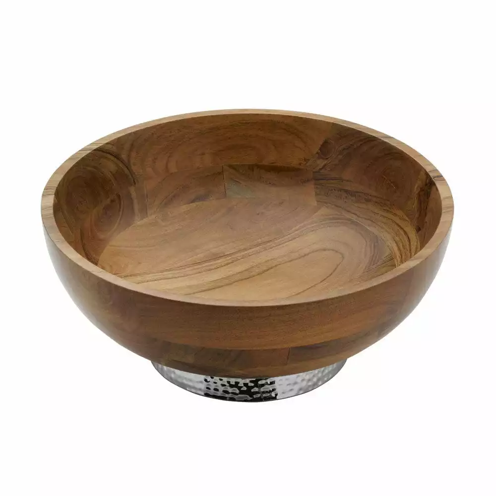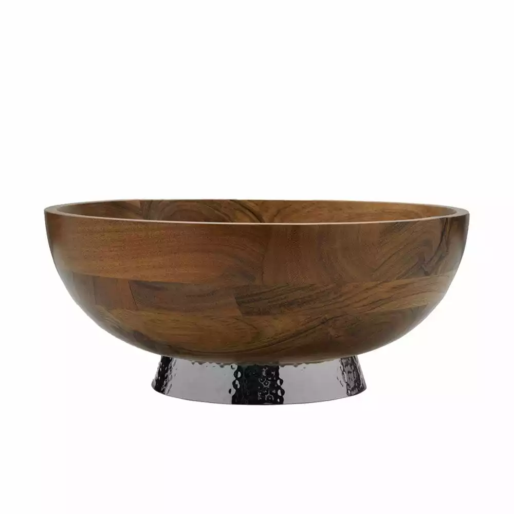 This Towle Hammersmith Wood Bowl with Hammered Base is beautifully crafted of acacia wood and sits on a hammered metal alloy pedestal base. It’s perfect for serving your guests in style and will add an elegant addition to your table.
