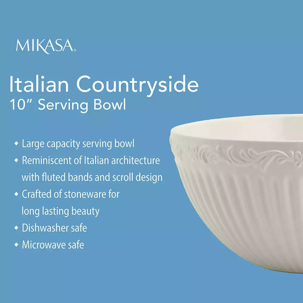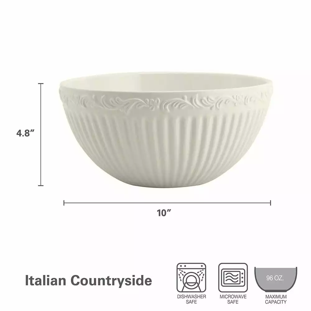 The fluted bands and column-like detailing of this dinnerware recall classical Italian architecture. A best selling pattern, a complete suite of accessories are available to create a classically stylish casual dining statement. Expertly crafted from stoneware, Italian Countryside is dishwasher and microwave safe. This bowl is ideal for serving a delicious array of dishes to accompany your entree. Fill with vegetables, fruit salad or pasta. Serve bowl measures 10 inch diameter x 4-3/4 inch high, holds 96 ounce.