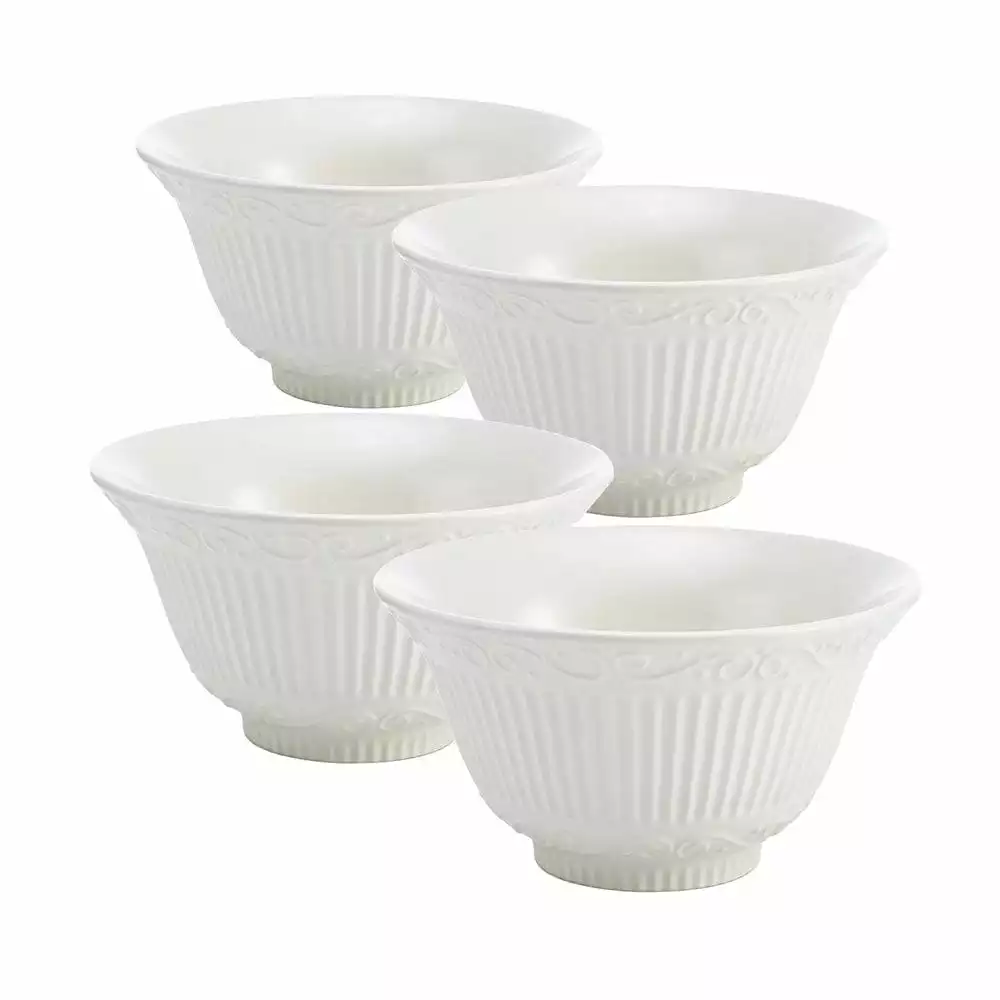 This Italian Countryside Set of 4 Footed Flared Soup Cereal Bowls feature a footed base to elevate them and our classic Italian Countryside fluting and scroll design, and will create a classically stylish dining statement.