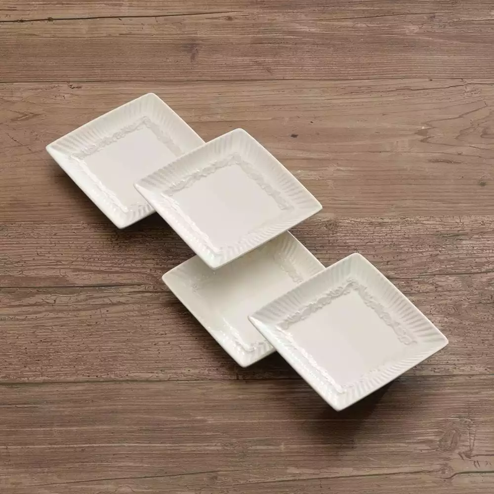 The fluted bands and column-like detailing of this dinnerware recall classical Italian architecture. A best selling pattern, a complete suite of accessories are available to create a classically stylish casual dining statement. Expertly crafted from stoneware, Italian Countryside is dishwasher and microwave safe. Pretty, functional and not only for dipping. This set of Square Dipping Plates are also great for small side servings, sauces or condiments. Set of 4 dipping plates, each 4-1/2 inch square.