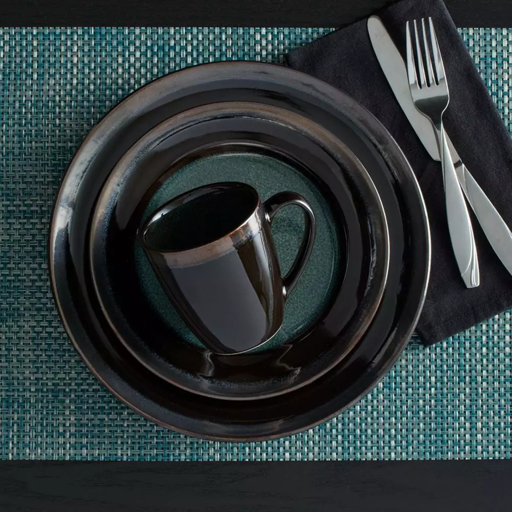 Crafted of Stoneware, featuring a reactive glaze. Due to the nature and hand-crafted qualities of reactive glaze, no two pieces are exactly alike and will exhibit unique variations in color and pattern. Product may slightly differ from image shown. Each service includes: 11 inch dinner plate, 8-1/2 inch salad plate, 6 inch appetizer plate, 8-1/2 inch diameter x 2-5/8 inch high (38 ounce) soup cereal bowl and 12 ounce coffee mug. Microwave and dishwasher safe.