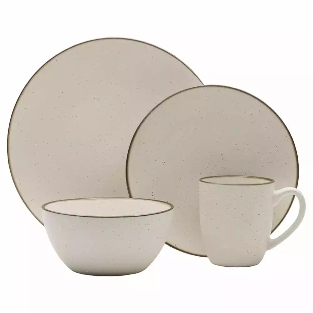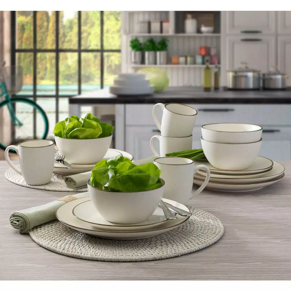 Crafted of stoneware. 16 piece dinnerware set, service for four, includes (4) each: 10-1/2 inch dinner plate, 8-1/4 inch salad plate, 6 inch diameter soup bowl and 13 ounce mug. Microwave and dishwasher safe.