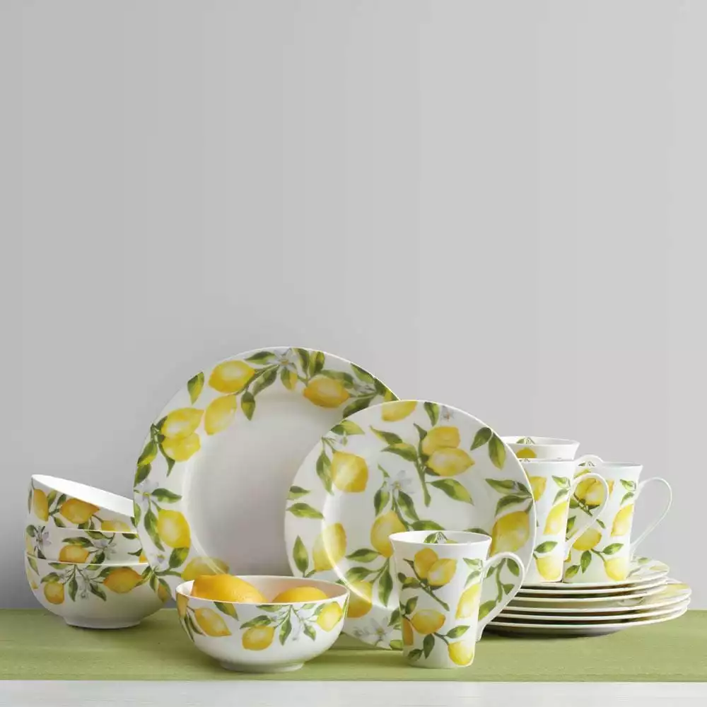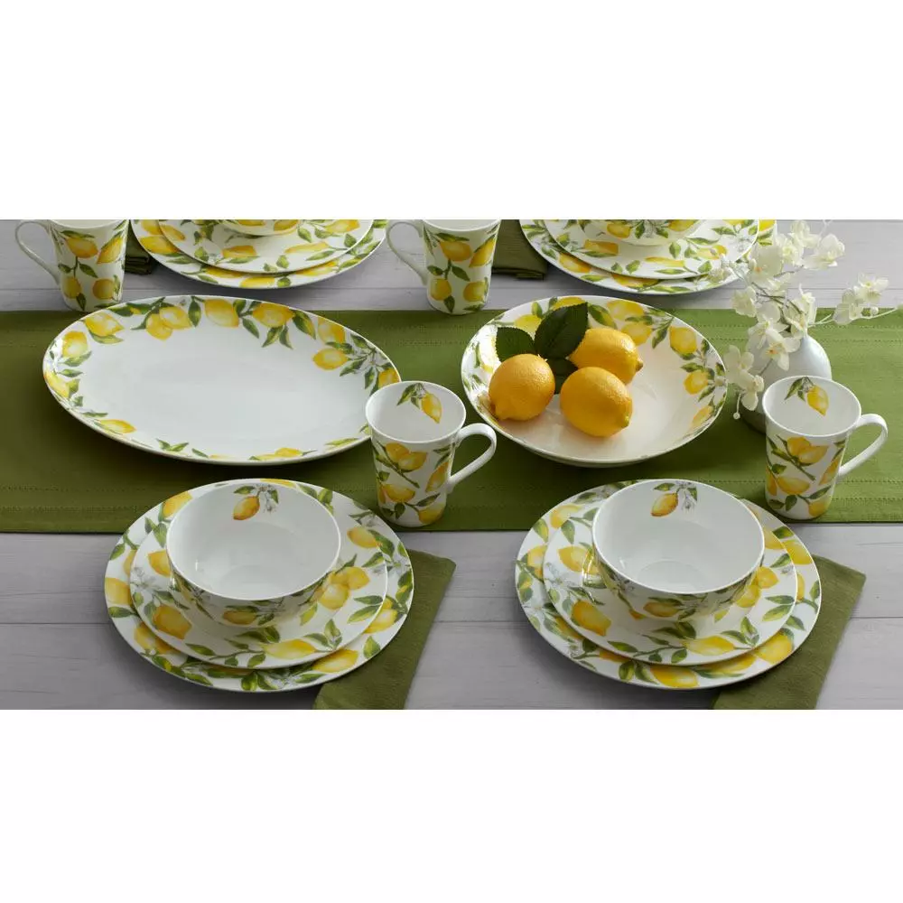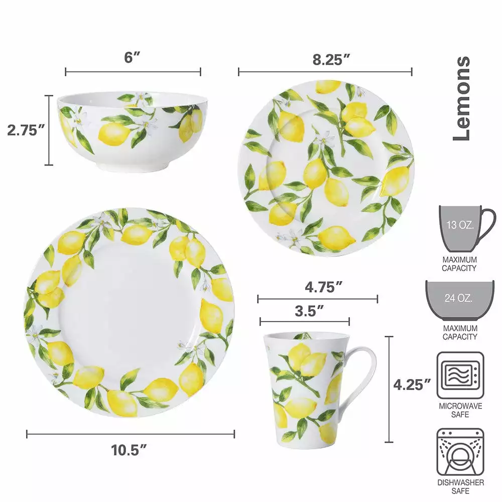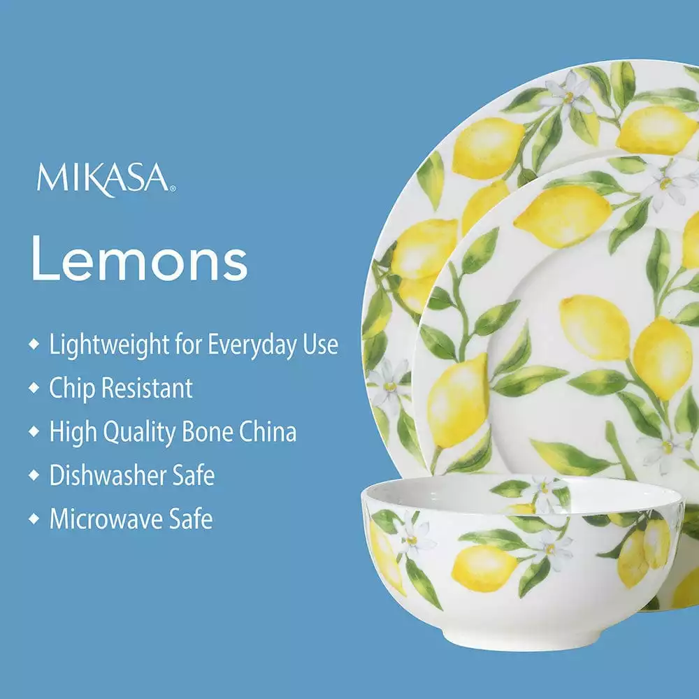Mikasa Lemons dinnerware features a beautiful lemon decal design. This timeless lemon, floral design, on a sleek round shape is perfect for formal or casual dining. Crafted of bone china. 16 piece dinnerware set, service for four, includes (4) each: 10-1/2 inch dinner plate, 8-1/4 inch salad plate, 6 inch cereal bowl and 13 ounce mug, Microwave and dishwasher safe.