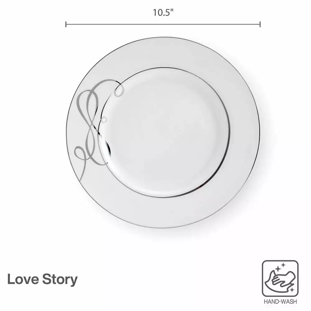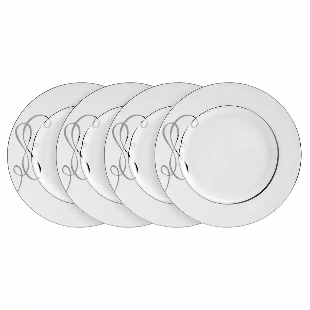 This Love Story Set of 4 Dinner Plates features a graceful ribbon heart motif in platinum accents that will help you celebrate true love and timeless elegance.