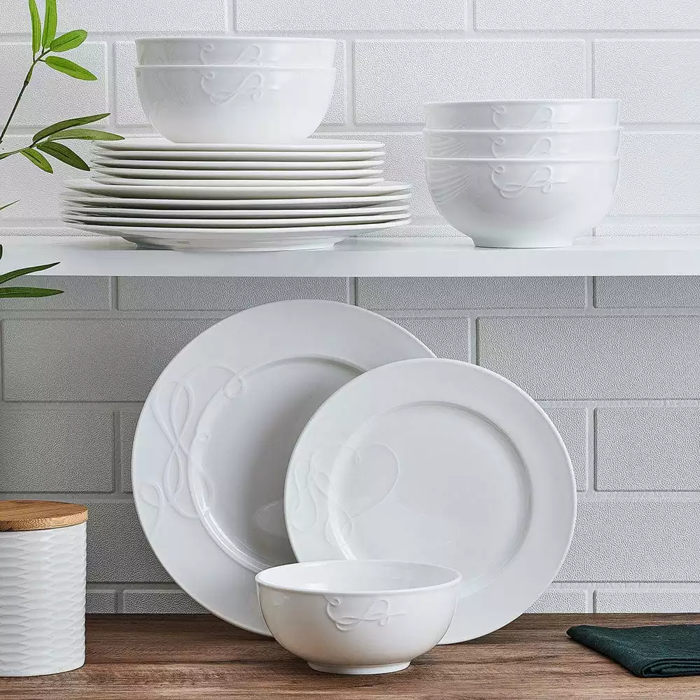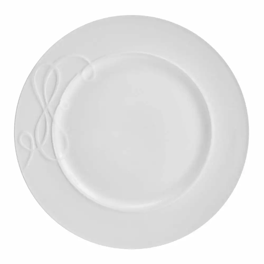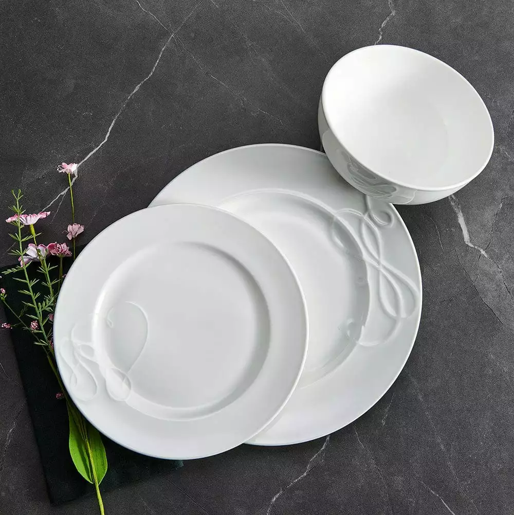 This Love Story White Dinnerware Set features a white body, with a distinctively different embossed pattern decorating the rim of each piece, and the elegant design can be used for formal or casual entertaining.
