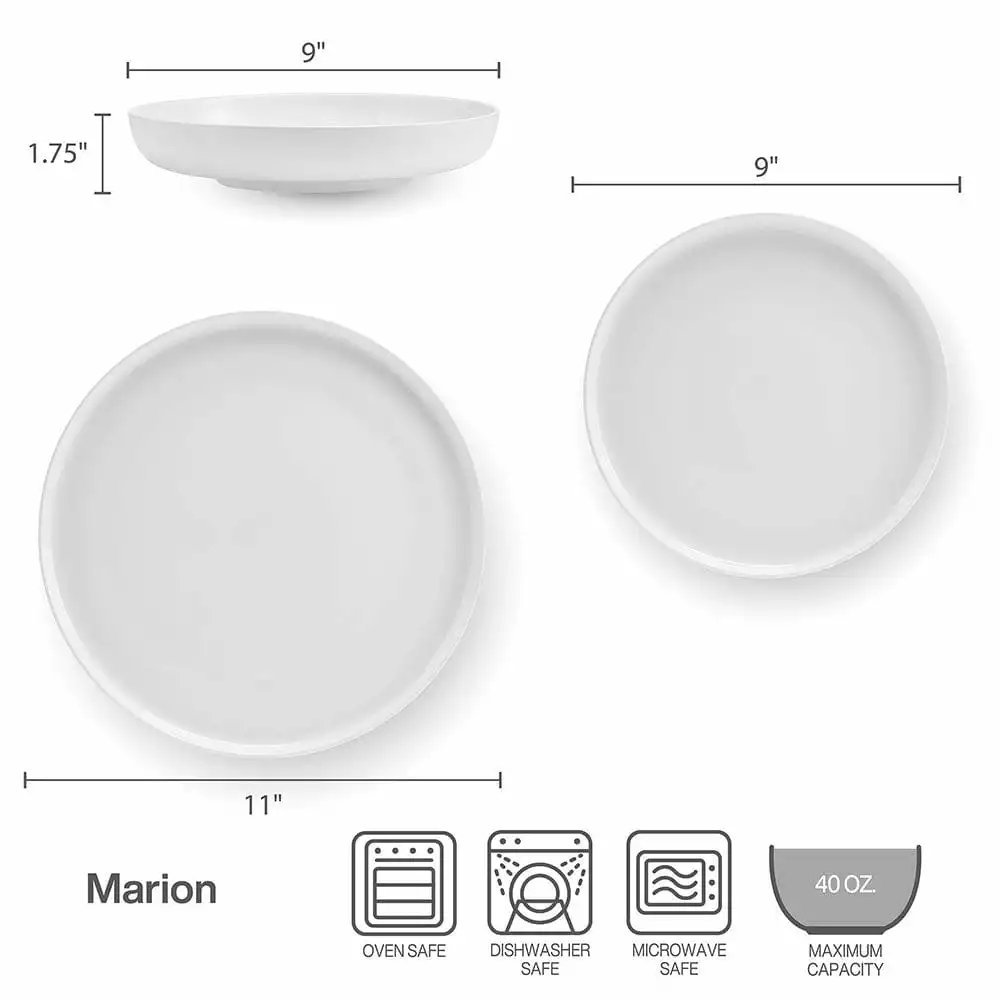 • Dinnerware set for 4: This 12 piece dinnerware set includes (4) each of: 11 inch dinner plate, 9 inch salad plate, and 9 inch diameter x 1-3/4 inch high (40 ounce) all-purpose bowl