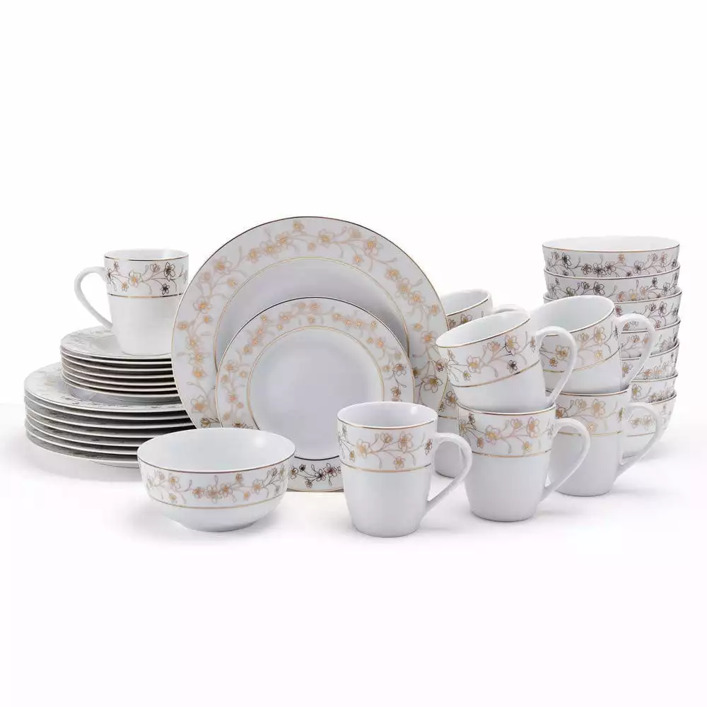 • Dinnerware Set for 8: This 32 piece dinnerware set includes (8) each of: 10-1/2 inch dinner plate, 7-1/2 inch salad plate, 5-1/2 inch all-purpose bowl, and 12 ounce teacup
