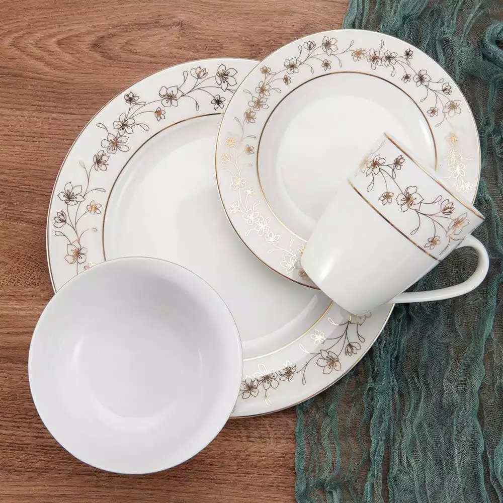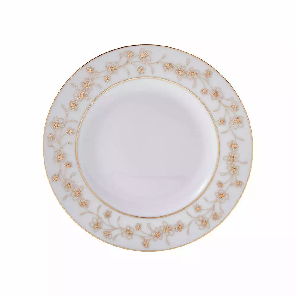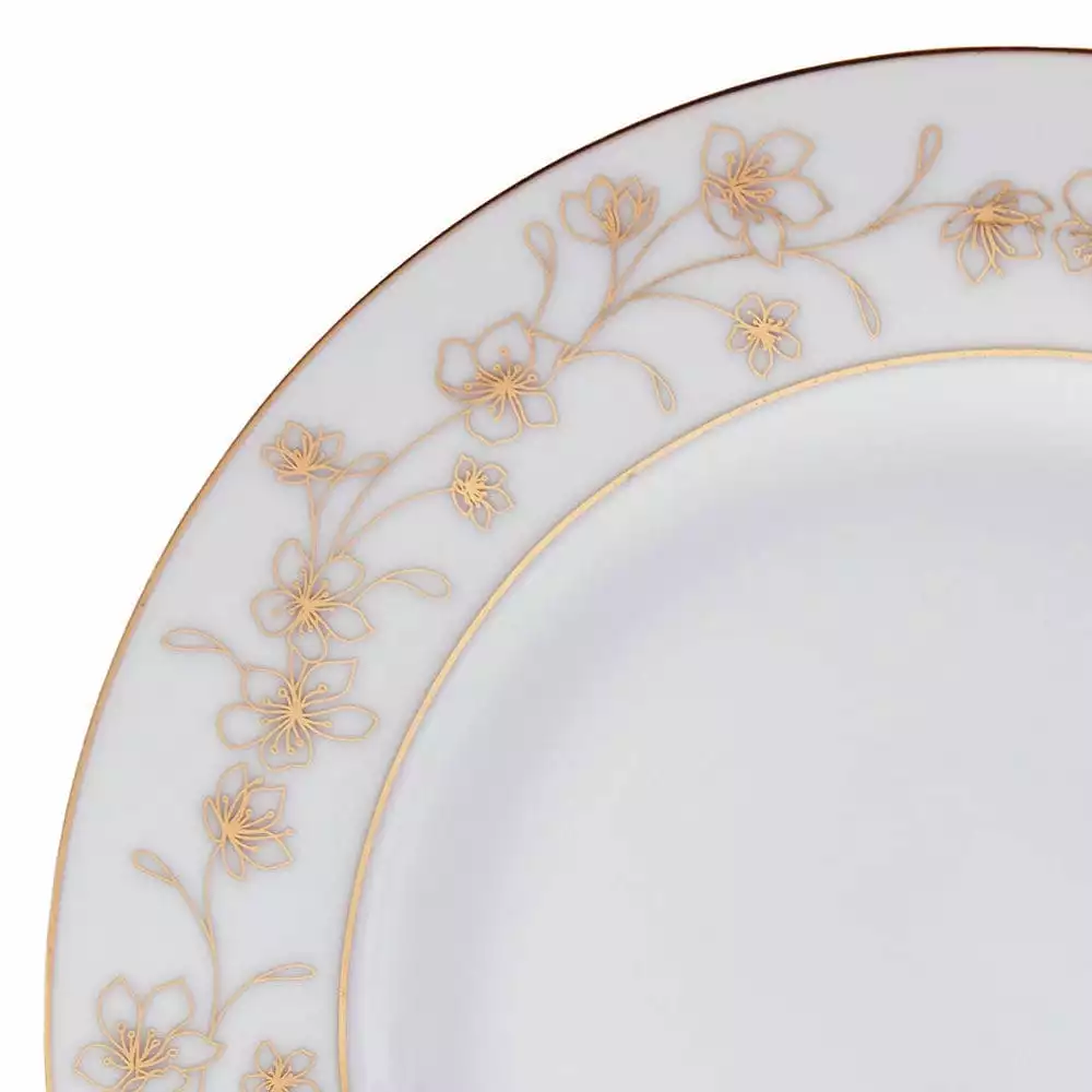 This Metallic Floral Gold Dinnerware Set features a white body, adorned with a garland of delicate florals in metallic gold, bringing a touch of elegance to your tabletop display.