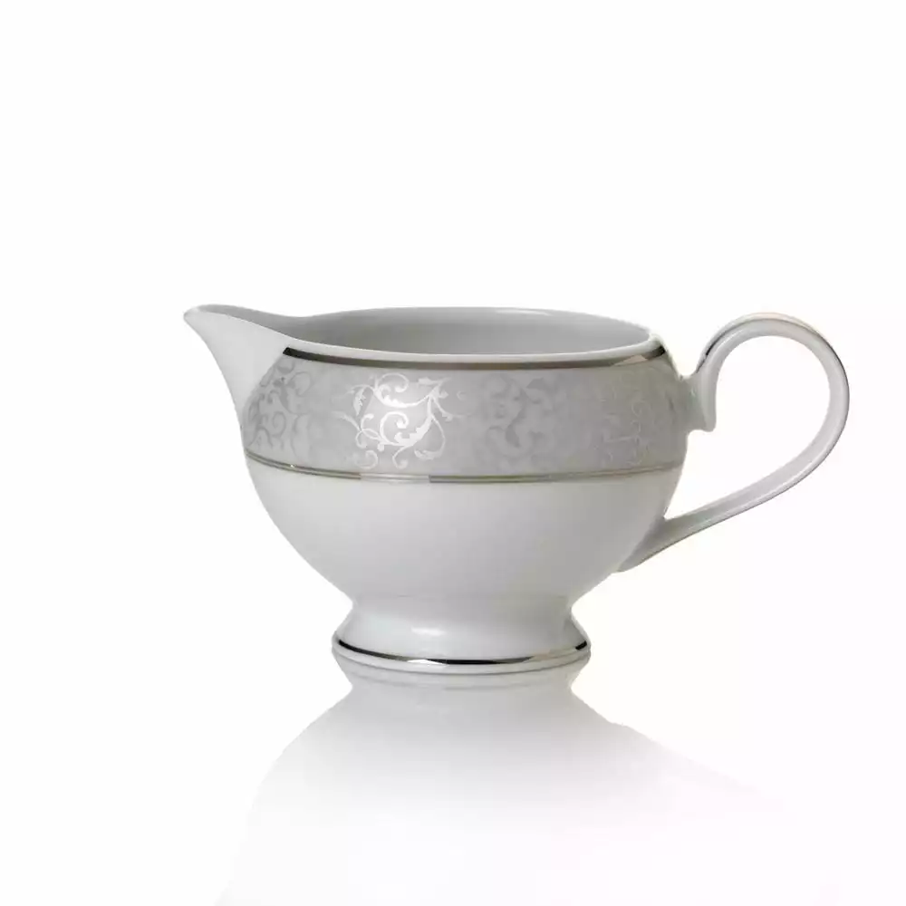 Parchment dinnerware collection features a gentle gray border embellished with a beautifully detailed scroll design. This chic and elegant collection is accented by inner and outer borders of platinum. Crafted of porcelain. Dishwasher safe but not microwave safe. Creamer holds 7 ounces.
