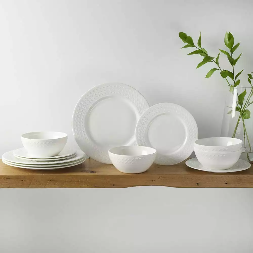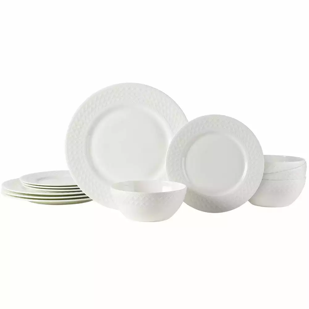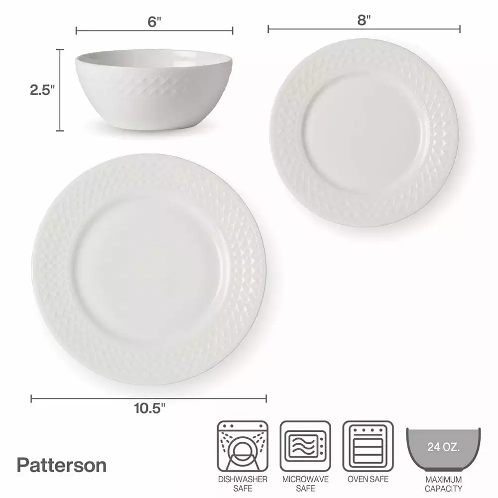 - Service for 4: This 12 piece dinnerware set includes (4) each of: 10-1/2 dinner plate, 8 inch salad plate, and 6 inch diameter (24 ounce) all-purpose bowl