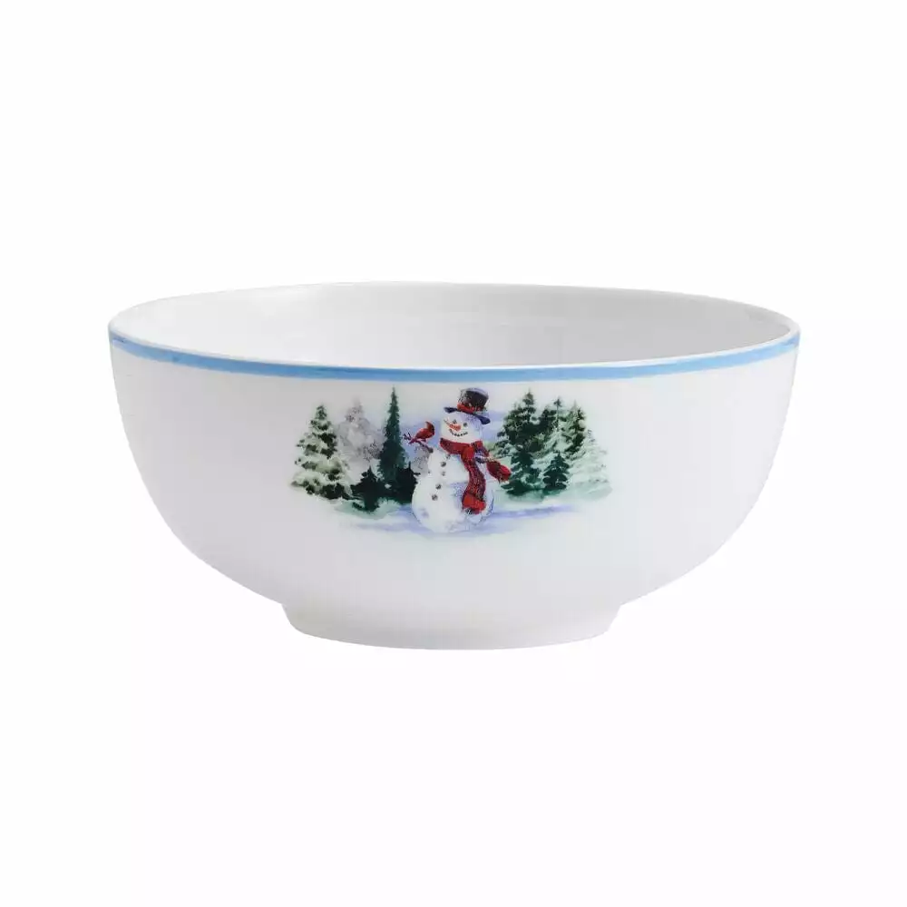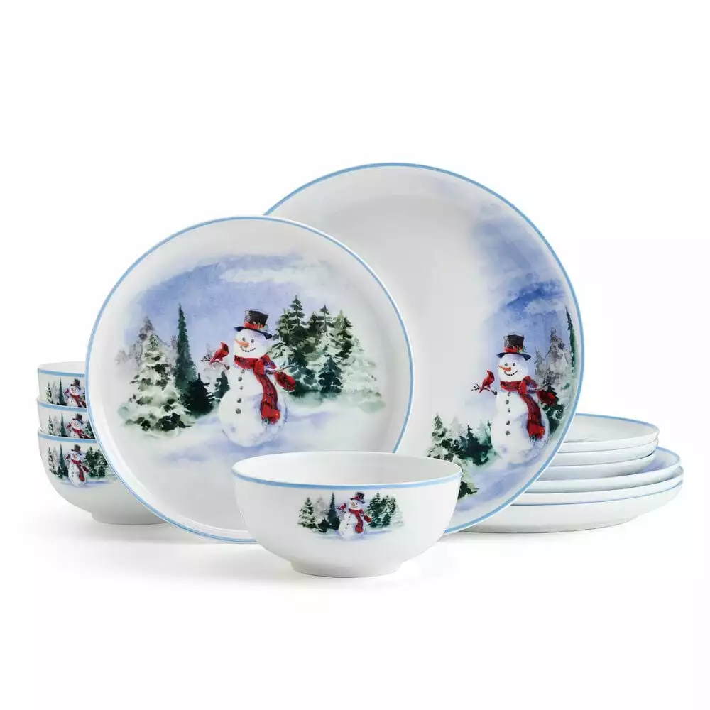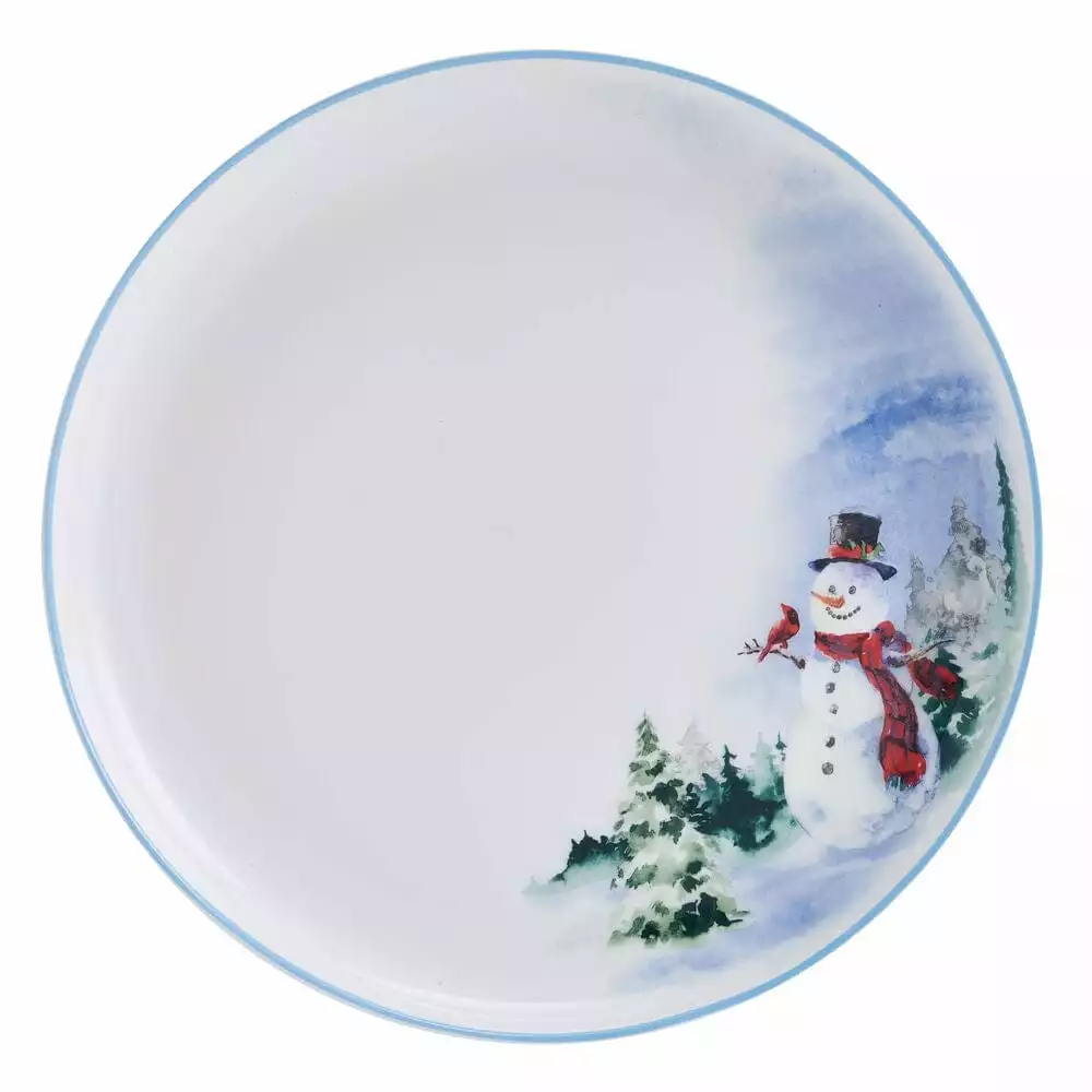 This Snowman Forest Dinnerware Set features a scenic watercolor snowman, adding a contemporary and stylish touch to your table for the winter season.