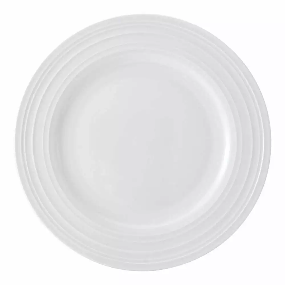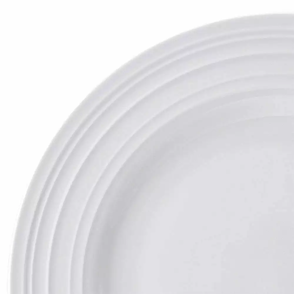 This Swirl Bone Dinner Plate features a clean white surface, with a striated line design wrapping around the rim, and will set a striking and original table.