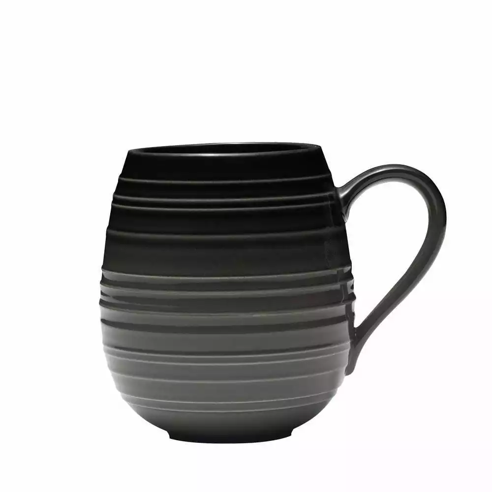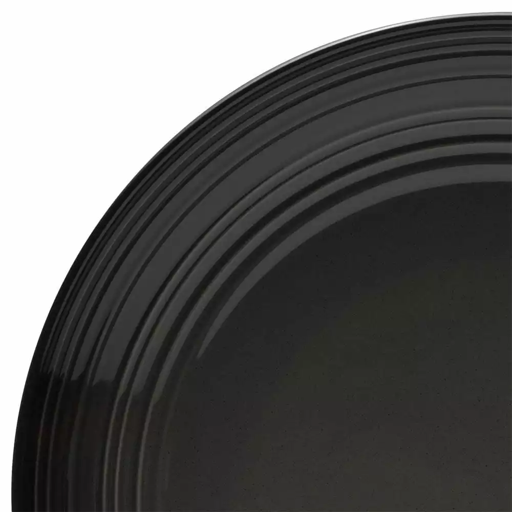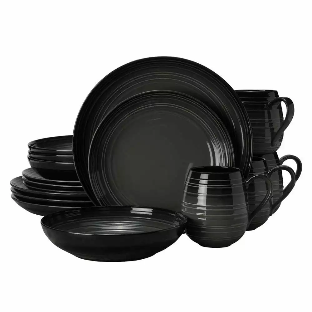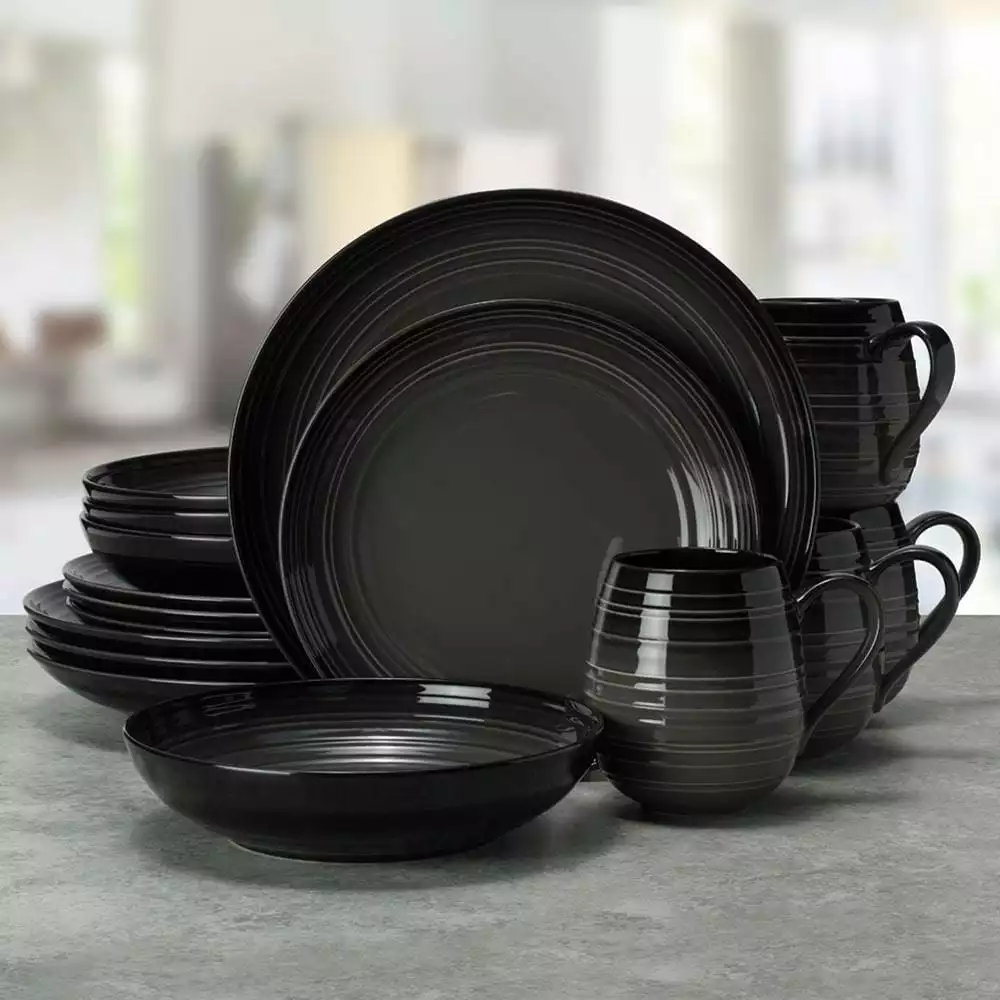 Swirl Black dinnerware combines a coupe shape, a shiny finish and a graphite ombre accent for a truly modern look. The graphite color will add a bold touch, and a striking statement with its versatile style. Crafted of ironstone with a pin-firing technique which allows the entire bottom of the plate to be glazed, including the base. This process significantly reduces water absorption and increases chip resistance. 16 piece dinnerware set, service for 4, includes (4) each: 11-1/4 dinner plate, 9-1/4 inch salad plate, 8-1/2 inch (40 ounce) soup cereal bowl and 20 ounce mug. Microwave and dishwasher safe.