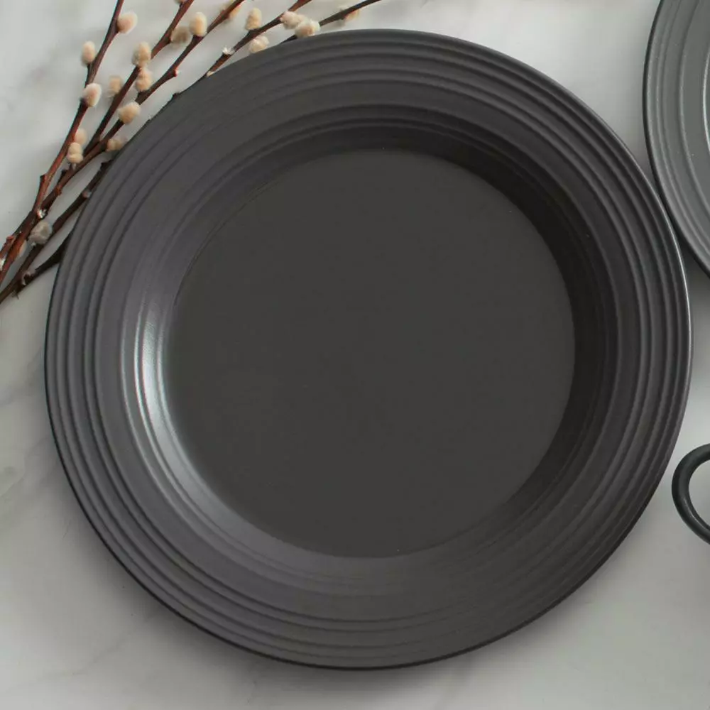 Swirl Graphite combines an organic shape, embossed texture, and dual, matte and shiny finish, for a truly modern look. Crafted of ironstone with a pin-firing technique which allows the entire bottom of the plate to be glazed, including the base. This process significantly reduces water absorption and increases chip resistance. Microwave and dishwasher safe. Round platter measures 12-1/2 inch diameter.