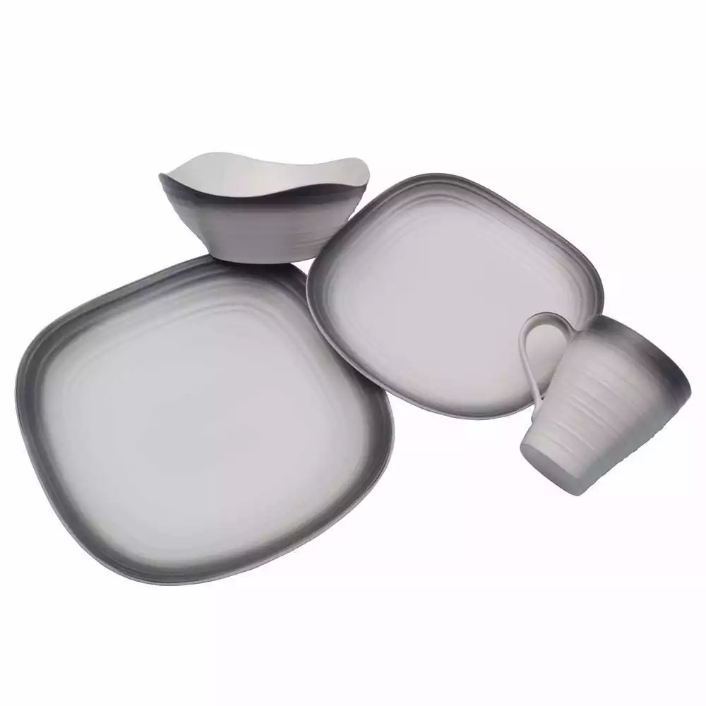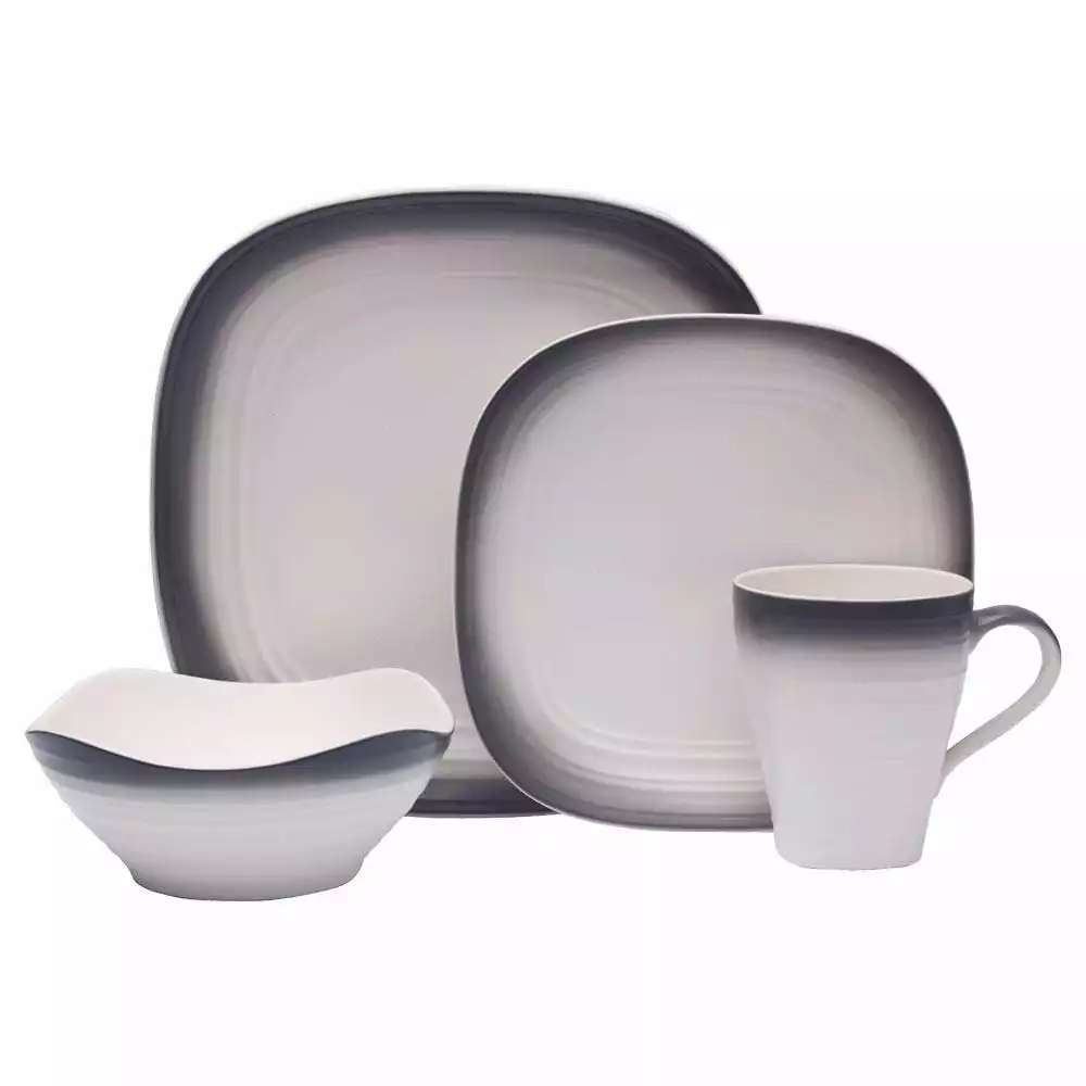 Swirl Ombre features clean lines in a rustic, earthy pattern with a matte and glossy finish, and beautifully graduated coloration, set a striking table setting. The soft rib on the outside of the collection offers a hand made look. Crafted of ironstone with a pin-firing technique which allows the entire bottom of the plate to be glazed, including the base. This process significantly reduces water absorption and increases chip resistance. 4 piece place setting includes an 11 inch square dinner plate, 8-1/2 inch square salad plate, 24 ounce square soup cereal bowl and 18 ounce square mug. Microwave and dishwasher safe.