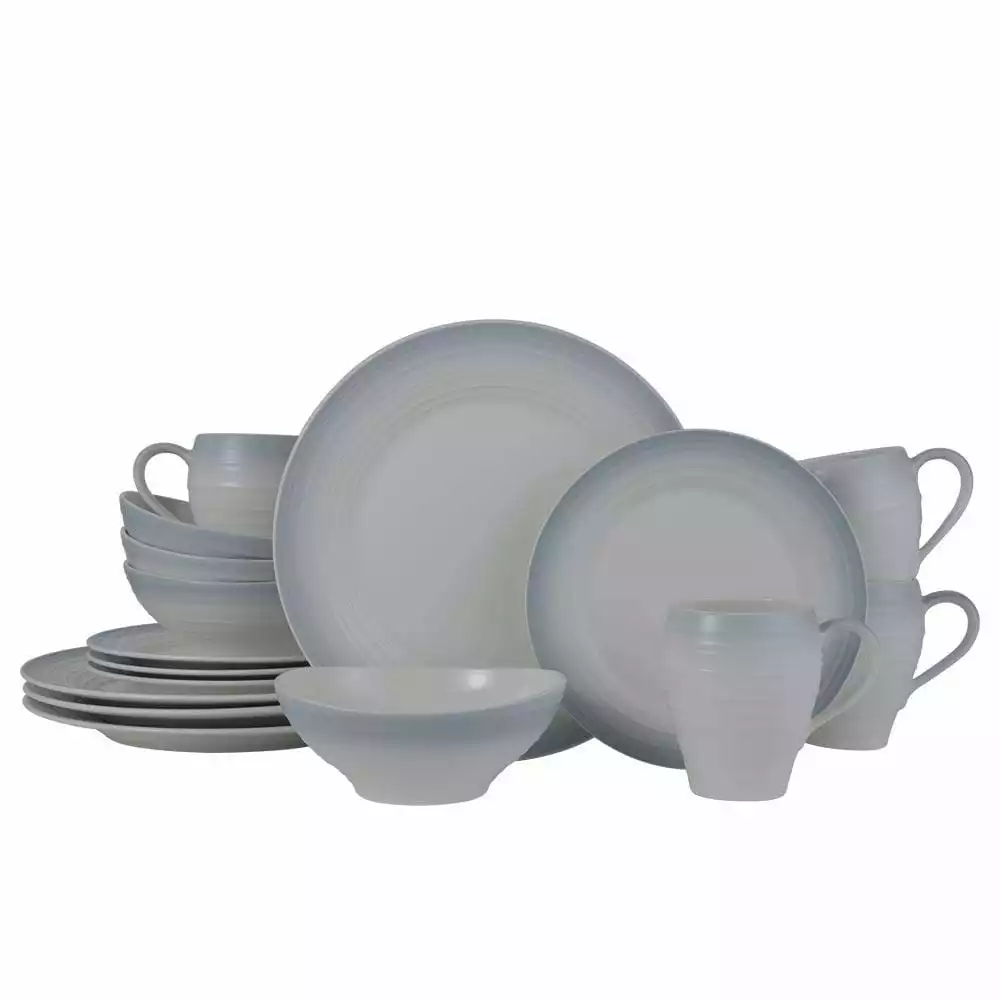 Swirl Ombre features clean lines in a rustic, earthy pattern with a matte and glossy finish, and beautifully graduated coloration, set a striking table setting. The soft rib on the outside of the collection offers a hand made look. Crafted of ironstone with a pin-firing technique which allows the entire bottom of the plate to be glazed, including the base. This process significantly reduces water absorption and increases chip resistance. 16 piece dinnerware set, service for four, includes (4) each: 11-1/4 inch dinner plate, 8-1/2 inch salad plate, 6-3/4 inch (24 ounce) cereal bowl and 18 ounce mug. Microwave and dishwasher safe.
