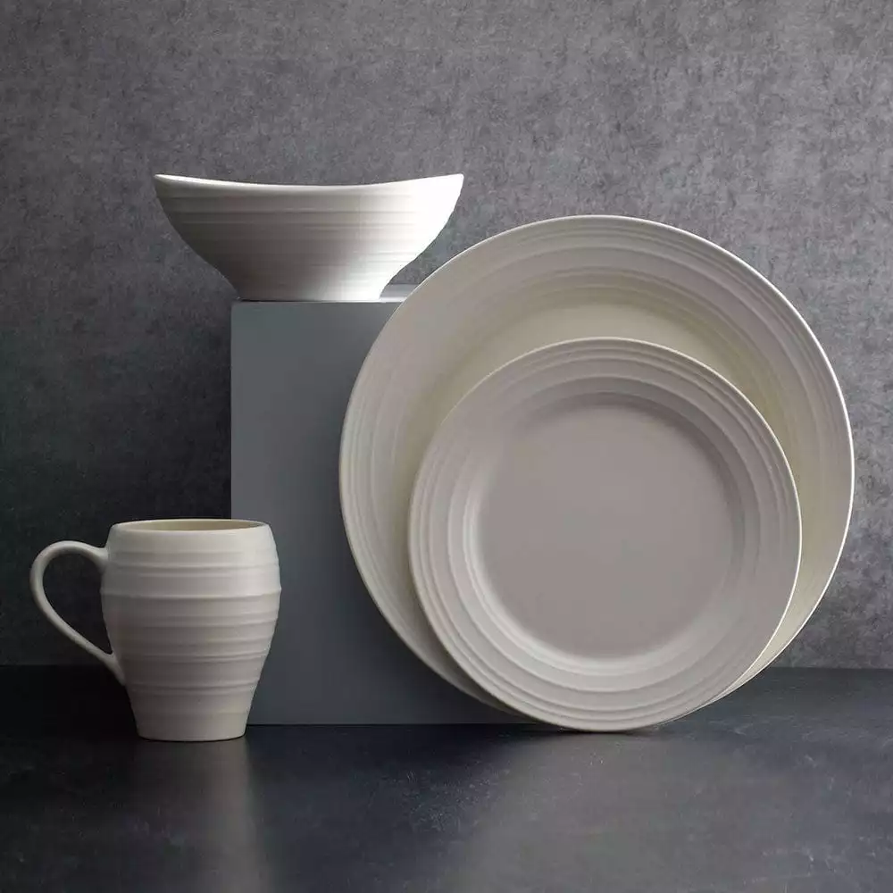 Swirl White’s rich, double finish – smooth and glossy on the inside, ribbed and matte on the outside – sets a striking and original tablescape. The soft rib on the outside of the collection offers a hand made look. Crafted of ironstone with a pin-firing technique which allows the entire bottom of the plate to be glazed, including the base. This process significantly reduces water absorption and increases chip resistance. 4 piece place setting includes an 11-1/4 inch dinner plate, 8-1/2 inch salad plate, 6-3/4 inch (24 ounce) cereal bowl and 18 ounce mug. Microwave and dishwasher safe.