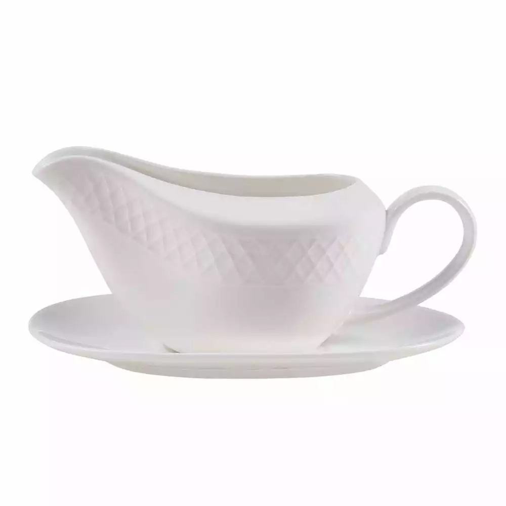 This Mikasa Trellis White Gravy Boat with Stand features a contemporary, criss-cross line design, creating eye-catching depth and movement on your tabletop. This casual and stylish dish is perfect for everyday use.