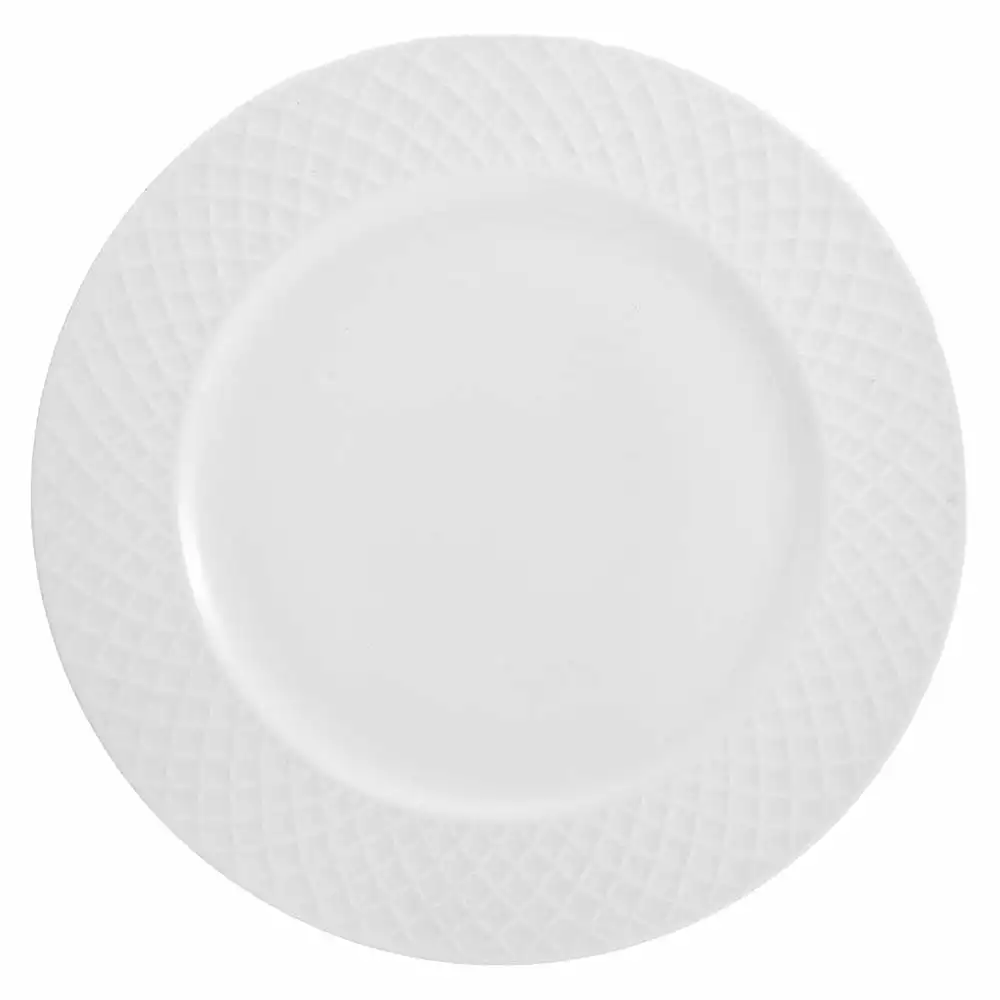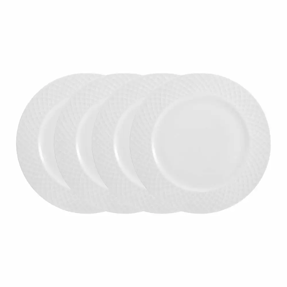 This Mikasa Trellis White Set of 4 Dinner Plates feature a contemporary, criss-cross line design framing the rim, creating eye-catching depth and movement on your tabletop.