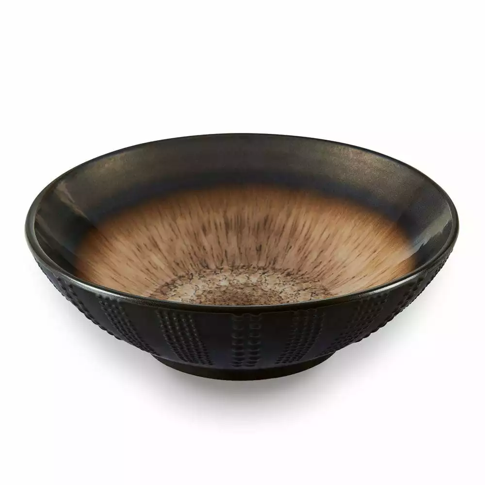 This Gourmet Basics Verona Cream Vegetable Bowl features a combination of speckles, dots, and linear striations in rich earth tones, with a reactive glaze finish. The contrast between the smooth center and the metallic rim creates a dramatic, modern look that commands attention on your tabletop. Due to the nature and hand-crafted qualities of reactive glaze, no two pieces are exactly alike and will exhibit unique variations in color and pattern. Product may slightly differ from image shown.