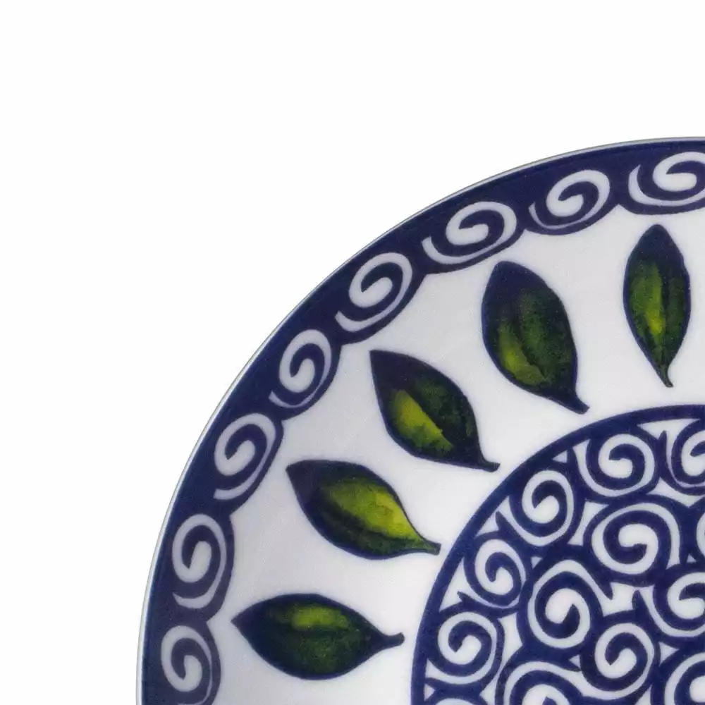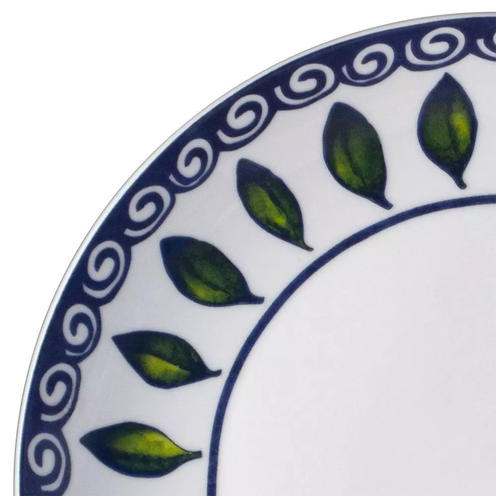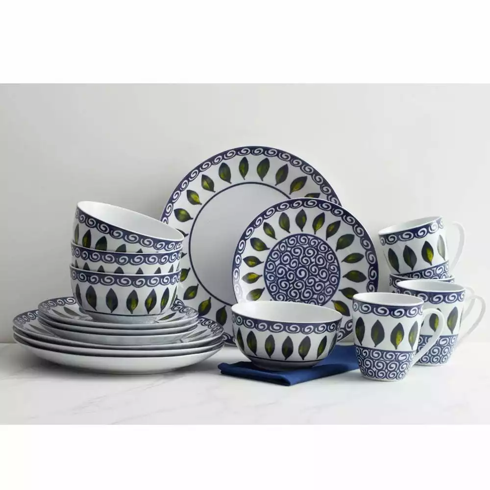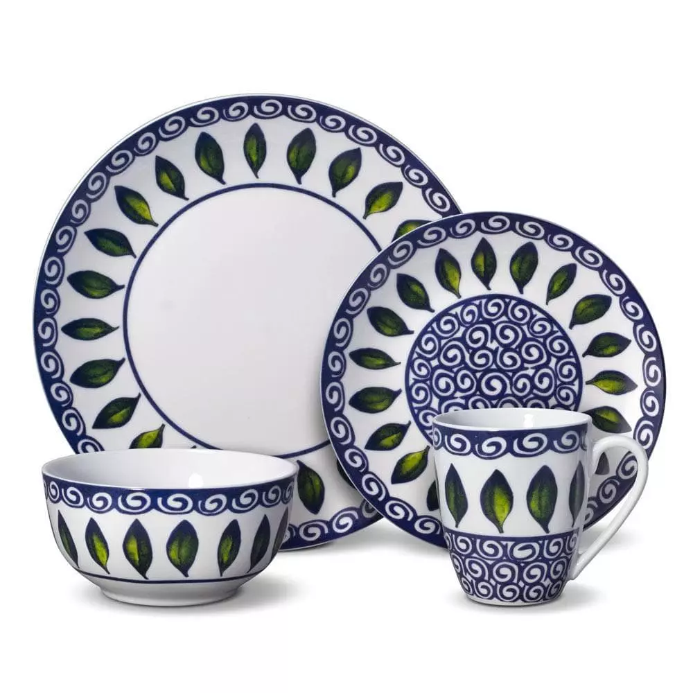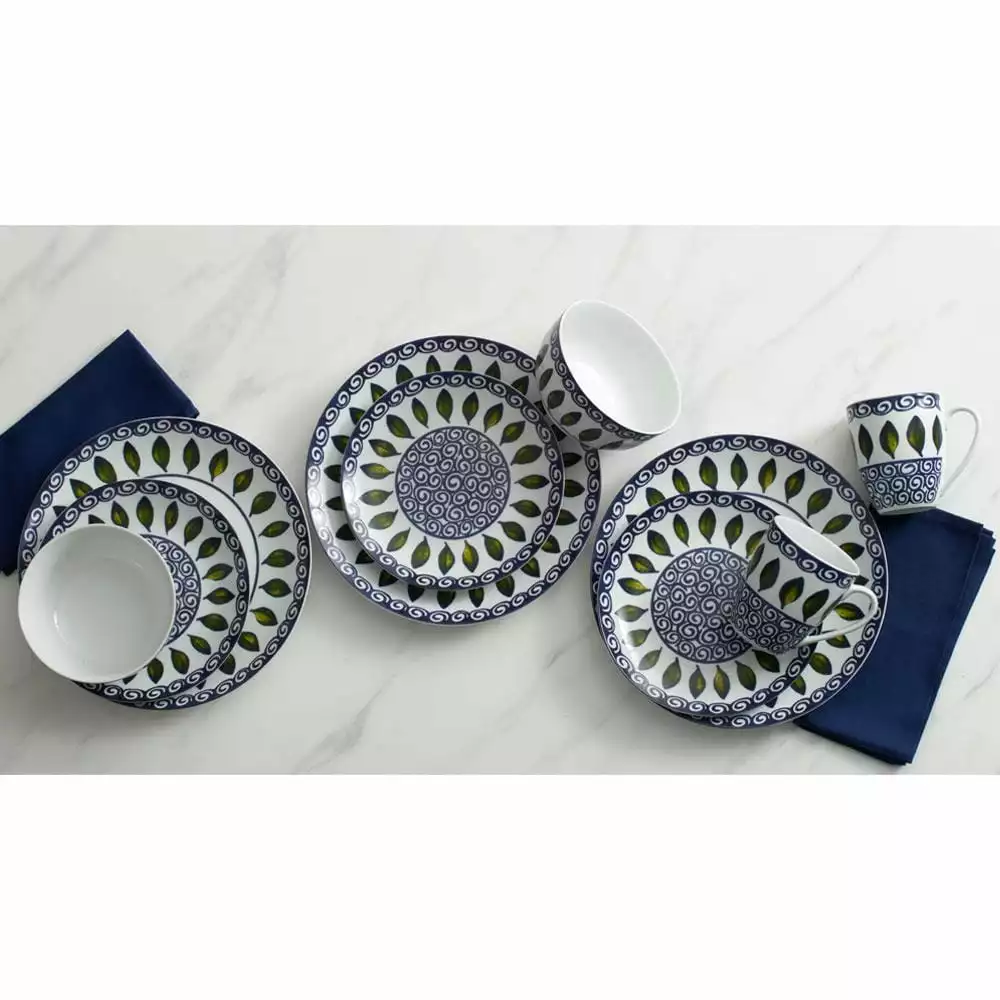 This Mikasa Vienna Dinnerware Set features a white background, with a green leaf pattern and a fun blue scroll design encircling the outer rim, and will surely add a distinct look to your table setting.