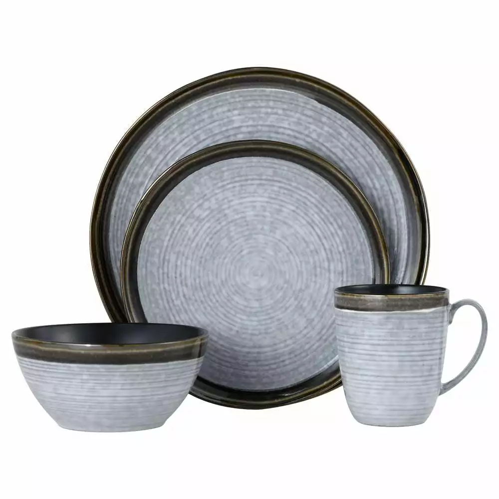 Crafted of stoneware, featuring a reactive glaze, Due to the nature and hand-crafted qualities of reactive glaze, no two pieces are exactly alike and will exhibit unique variations in color and pattern. Product may slightly differ from image shown. 16 piece dinnerware set, service for four, includes (4) each: 11 inch dinner plate, 8-1/2 inch salad plate, 6 inch soup cereal bowl and 12 ounce mug. Microwave and dishwasher safe.