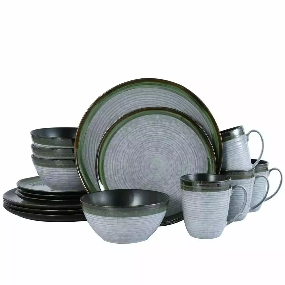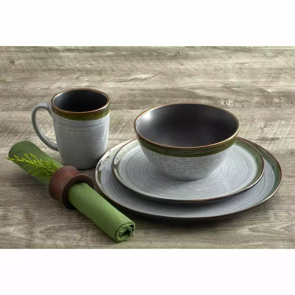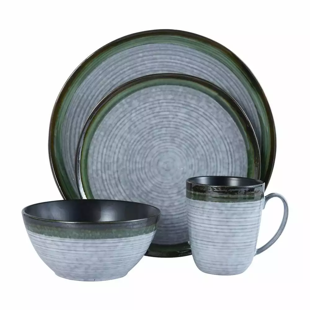 Crafted of stoneware, featuring a reactive glaze, Due to the nature and hand-crafted qualities of reactive glaze, no two pieces are exactly alike and will exhibit unique variations in color and pattern. Product may slightly differ from image shown. 16 piece dinnerware set, service for four, includes (4) each: 11 inch dinner plate, 8-1/2 inch salad plate, 6 inch soup cereal bowl and 12 ounce mug. Microwave and dishwasher safe.