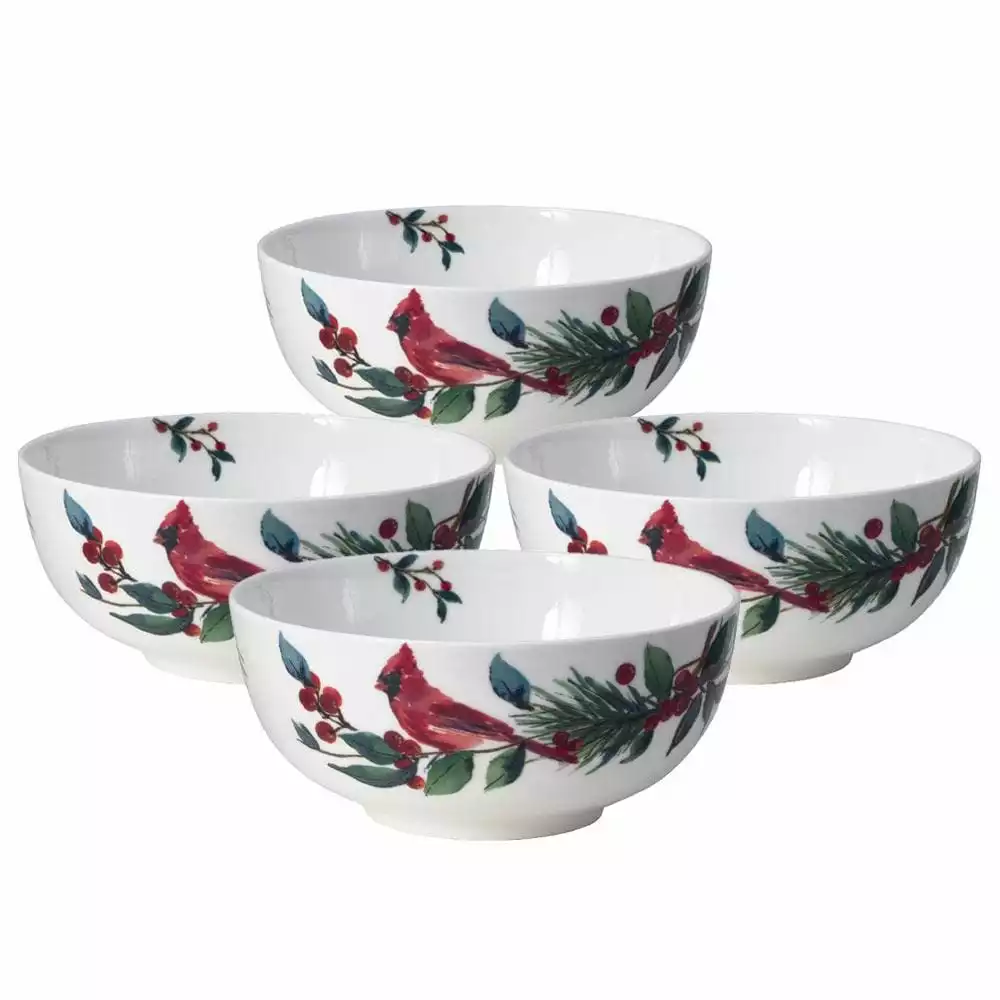 This Mikasa Winter Cardinal Set of 4 Soup Cereal Bowls feature a beautiful watercolor poinsettia and cardinal design. Perfect for everyday use; can be dressed up or down for all your holiday gatherings.